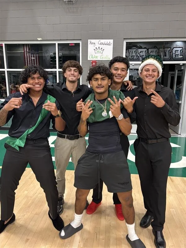 Carlos Flores Won Homecoming King and was taking a picture with some friends from the football team including Quinn Martinez, Xyloh Kuresa, Cameron Jimenez, and Owen Gully on September 17, 2025, inside Manteca’s Big gym.