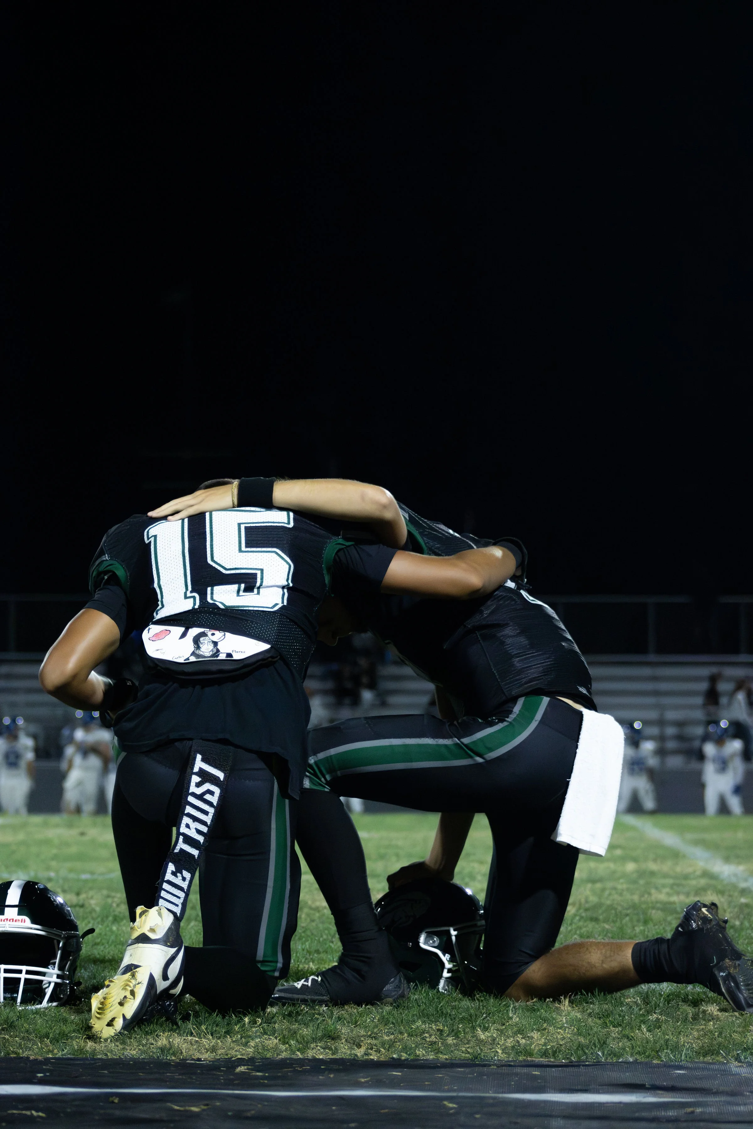Carlos Flores praying on a knee with Owen Gully, against Sierra on October 3rd, 2025, at Gus Schmiedt field.