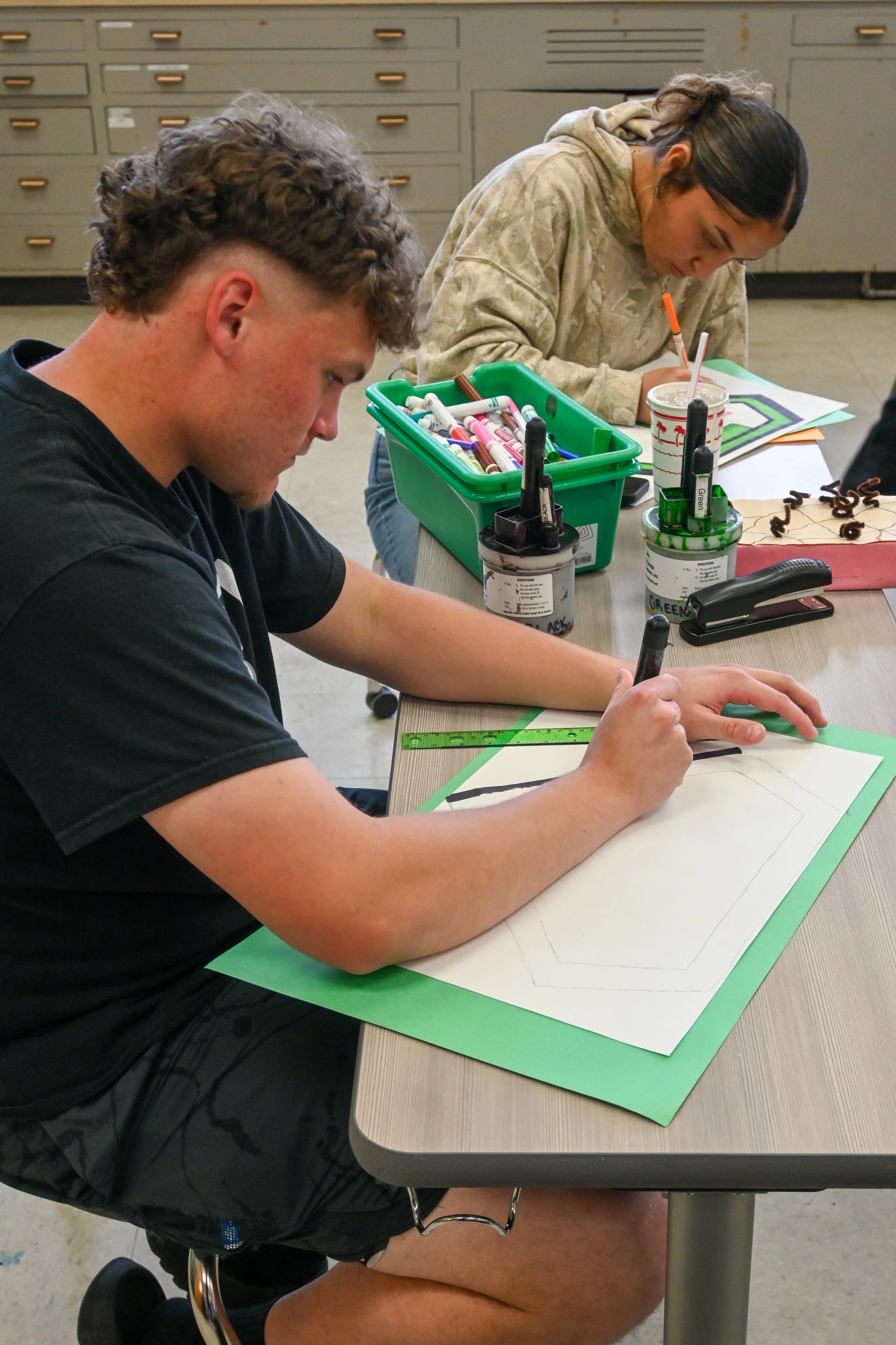 Devon Richardson is sitting down in class tracing out a superman logo with a marker on March 2, 2026, In Manteca, California, at Manteca High. (Rob Nelson/The Tower)