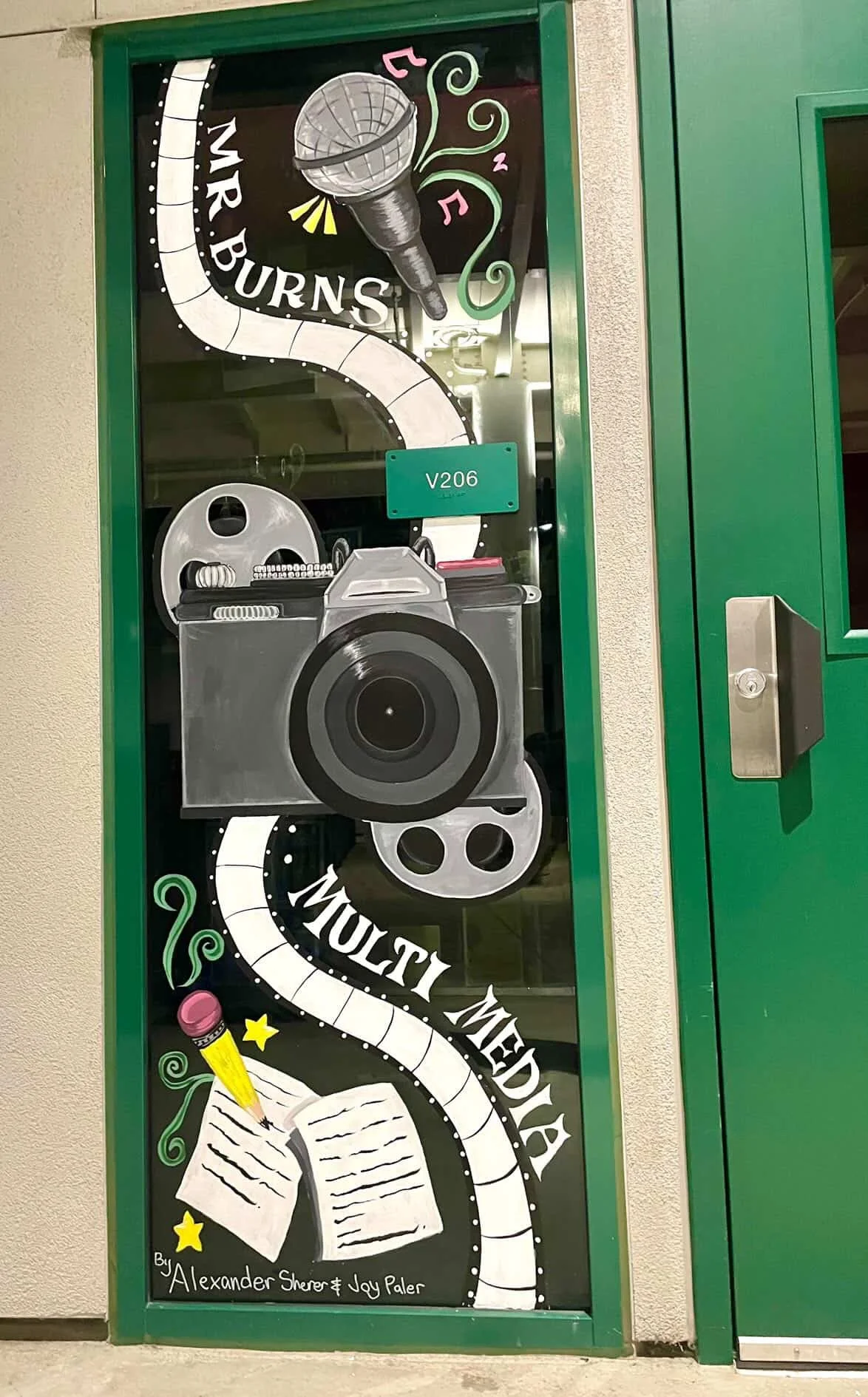 Multimedia teacher Mr. Burns’ classroom window painted by seniors Joy Payler and Alex Sheerer (Photo Contributed)