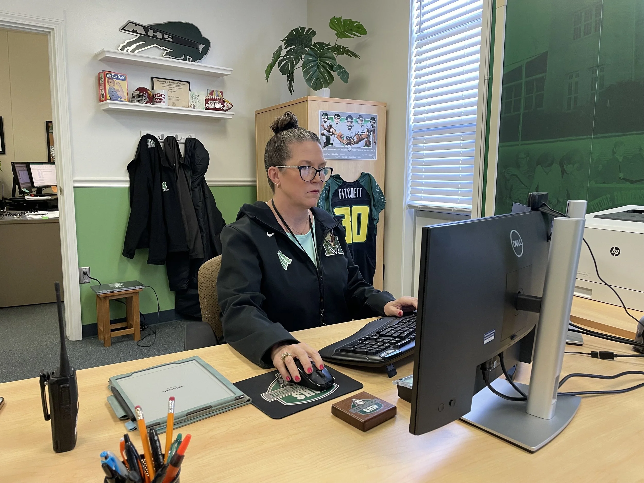 Manteca High principal Megan Peterson works on her computer in her office on Wednesday, Nov. 8, 2023. Peterson believes a program like Honor the Code will help curb the recent spike in fights on campus. (Caleb Reynolds)
