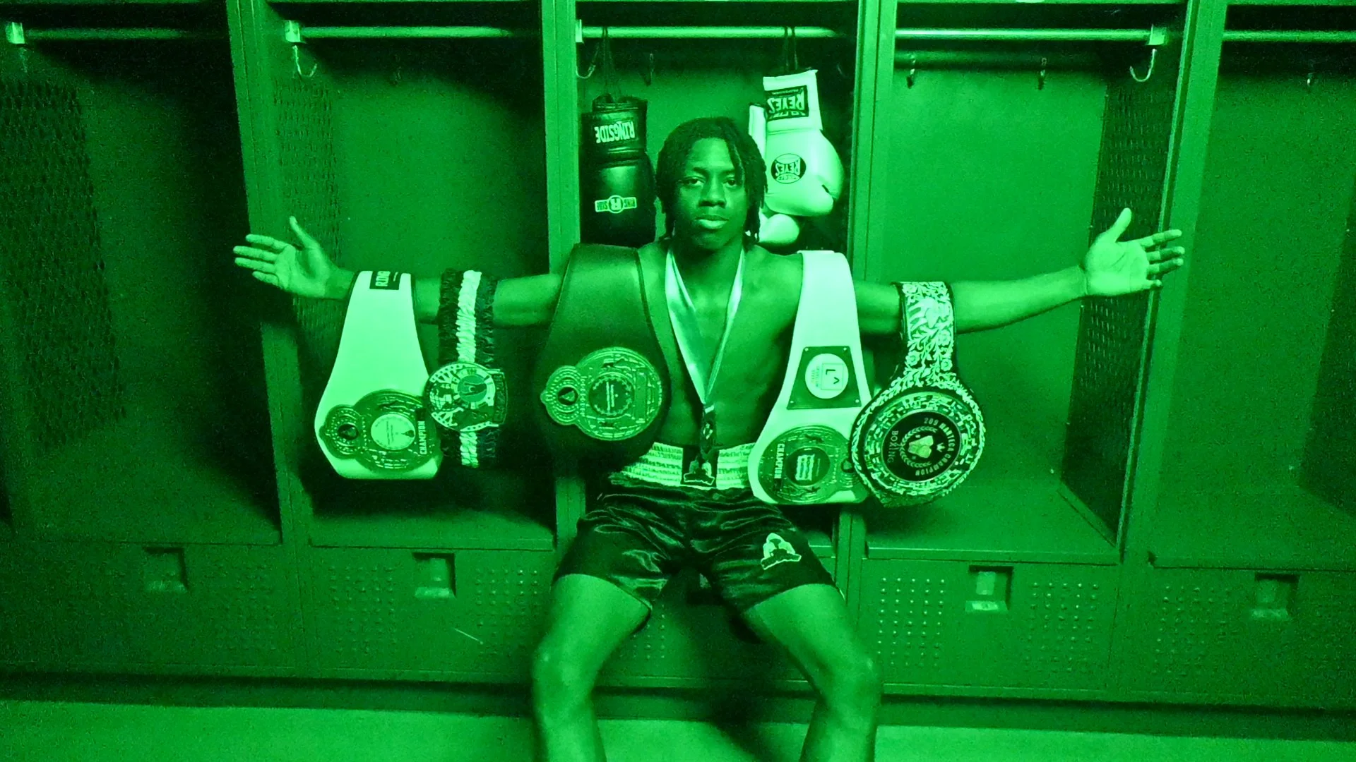 Manteca High senior Elijah Stevenson is pictured with belts that he’s won as an amateur boxer. He will make his professional debut on June 27, 2026.