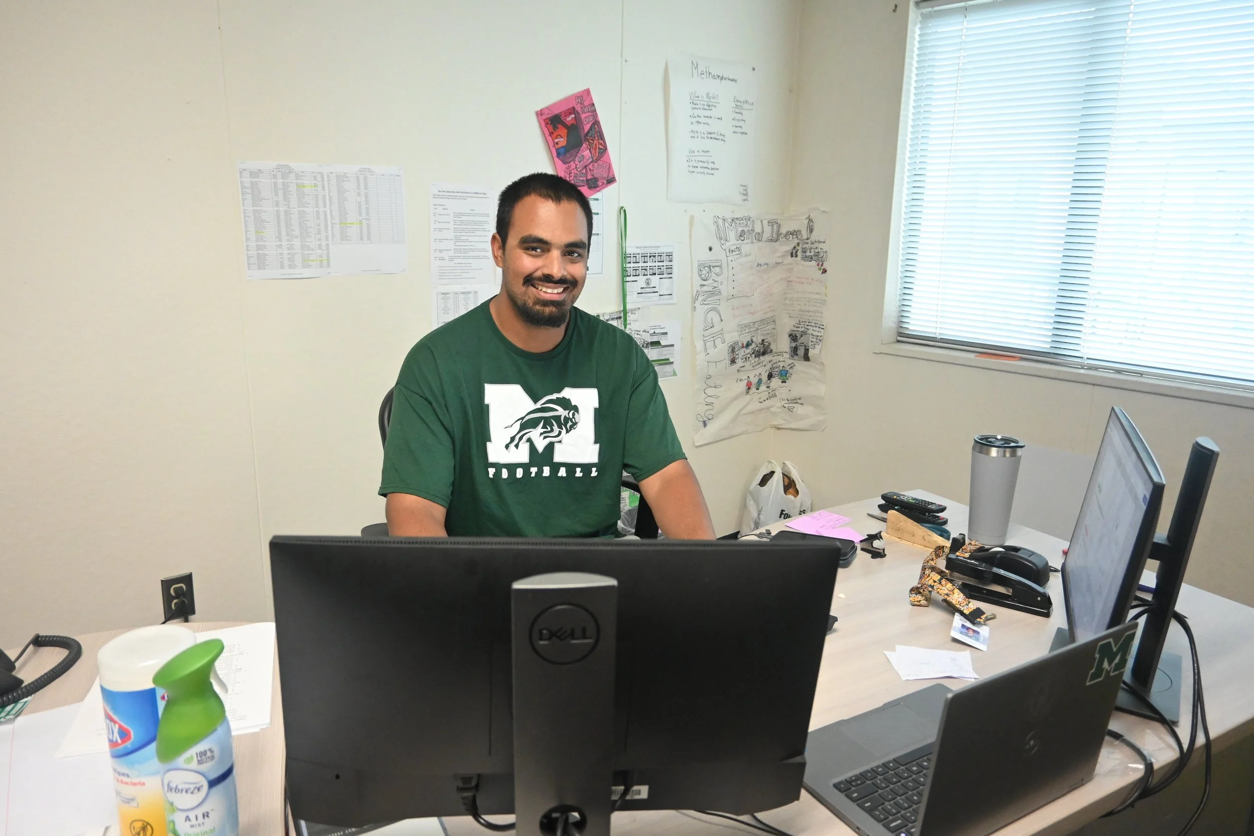 Manteca High School Health Education teacher and Junior Varsity football coach Andrew Cokley works at his desk in room 123 on October 1st, 2025. (Alexis Leal/The Tower)