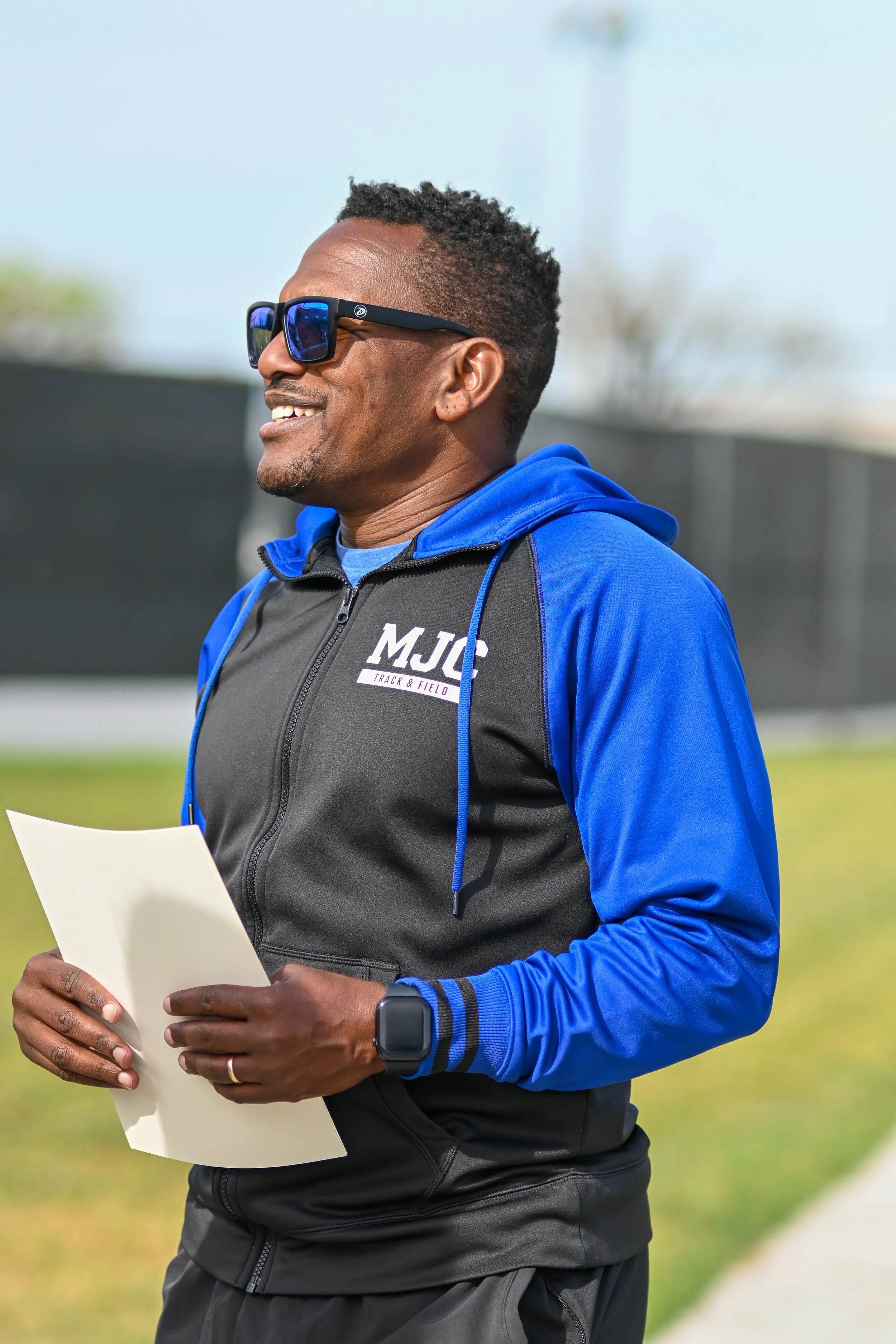 Modesto Junior College track and field head coach Demitrius Snaer is pictured on the field during the Coast vs. Valley Invitational in Modesto, Calif., on Friday, March 27, 2026. (Isaiah Manzo/The Tower)