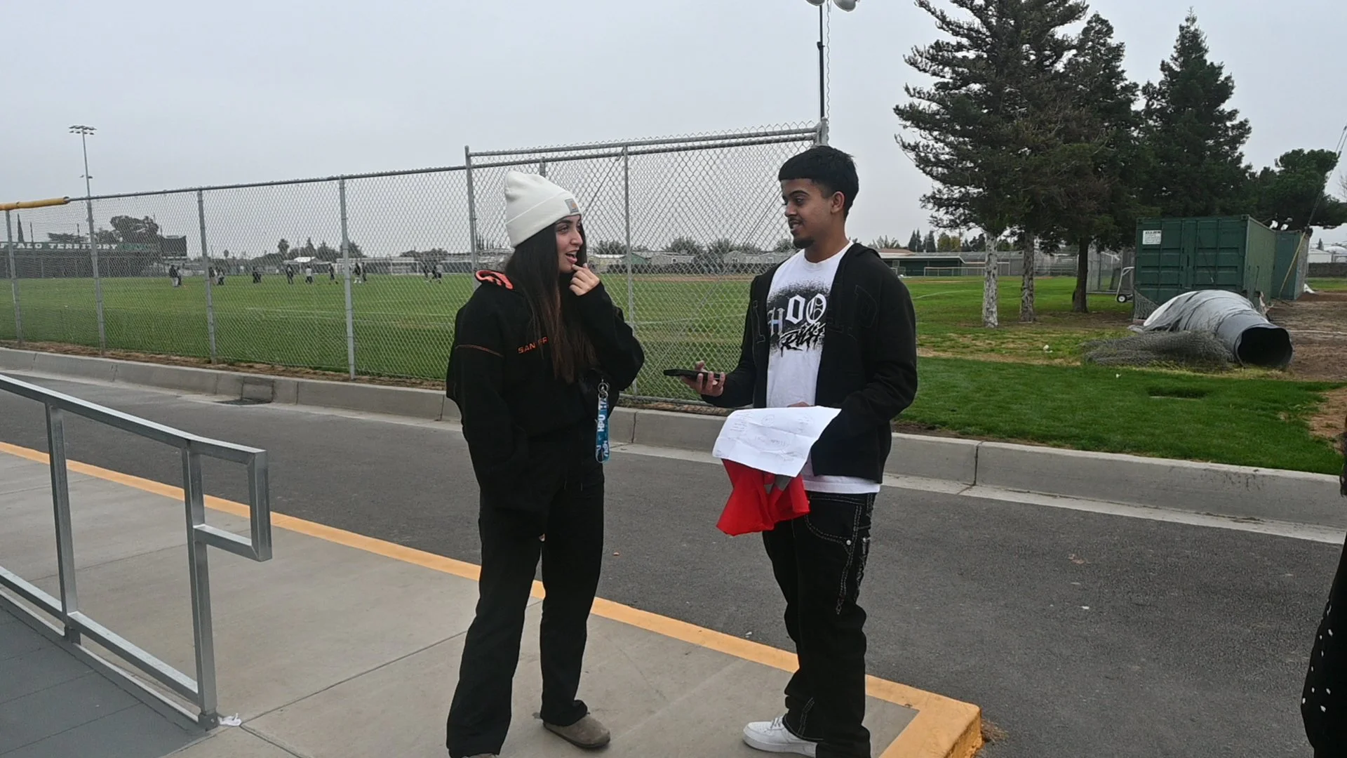 Manteca Softball Player Isabelle Latona being interviewed by Jasreet Saran next to the classes by the student parking lot on December 10, 2025 (Diego Aguilar).