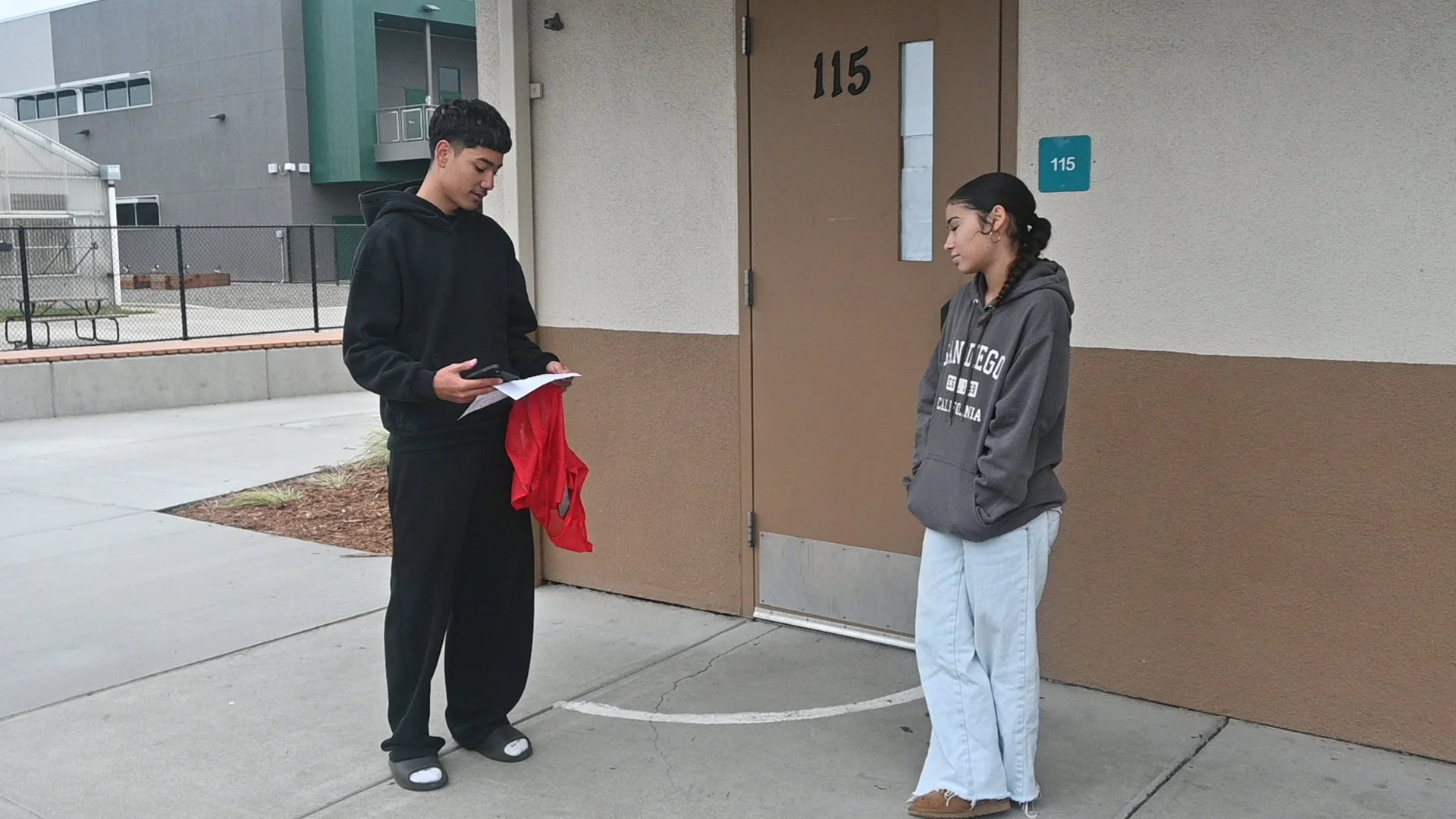 Manteca Soccer Player Kailley Jackson being interviewed by Vincent Martinez in front of the classes by the softball field on December 10, 2025 (Diego Aguilar).