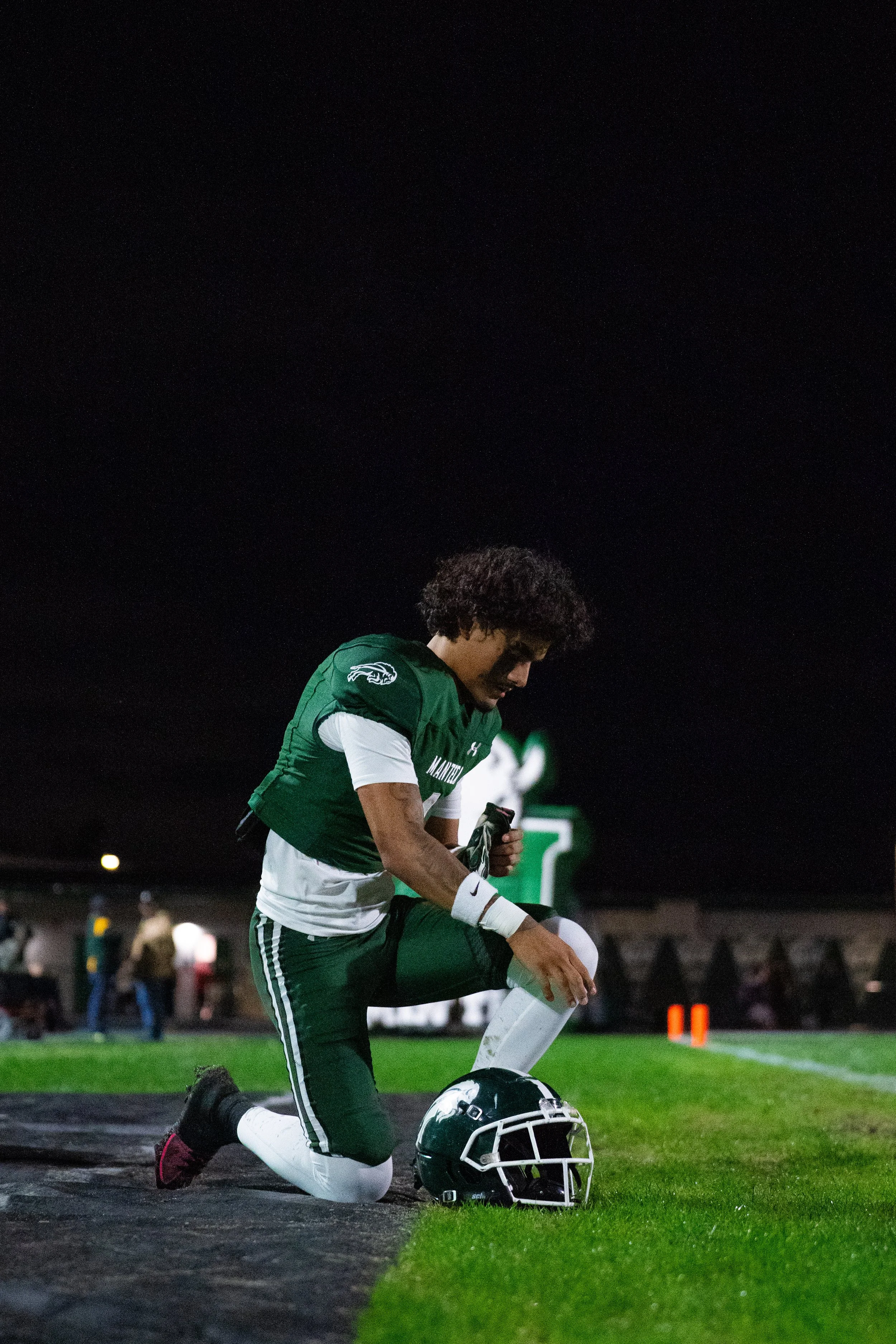 Manteca Football player Quinn Martinez taking a knee to pray before a game on Gus Schmiedt Field (Raclif Figueroa)