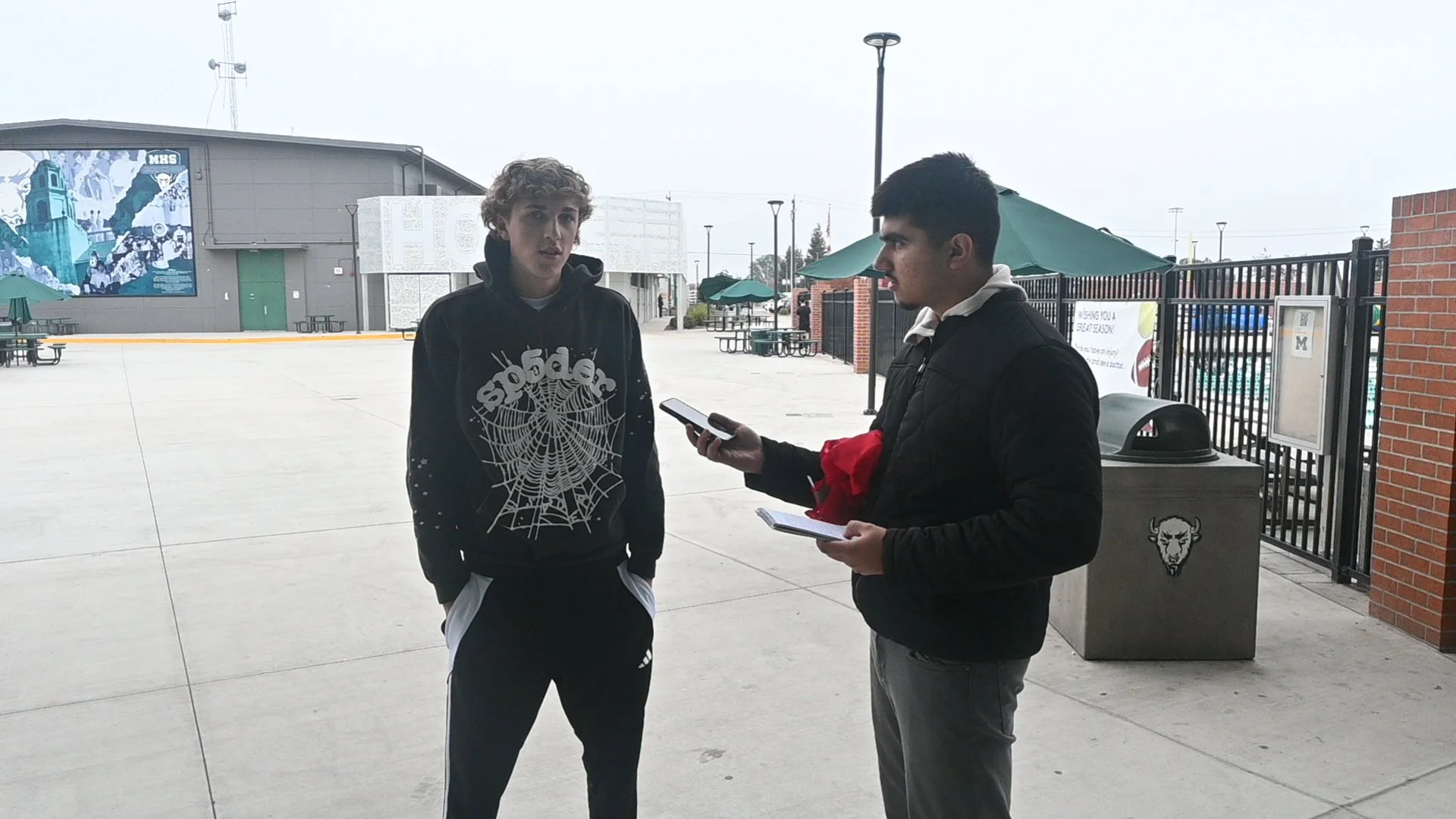 Manteca Basketball player Austin Barnes being interviewed by student reporter Muzammil Hakim in front of the New Gym on December 10, 2025 (Diego Aguilar)